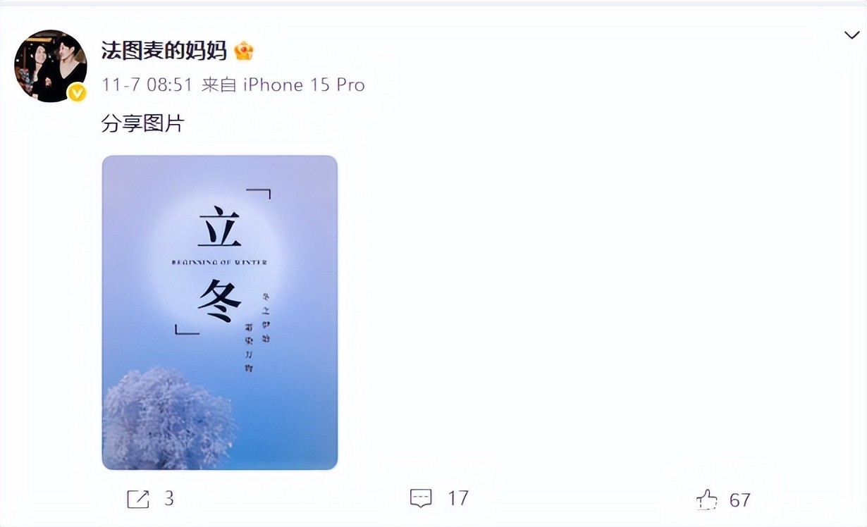 近况如何而前些天立冬时哈女士还分享图片来着,不过只是张风景图,看不到她的现状,